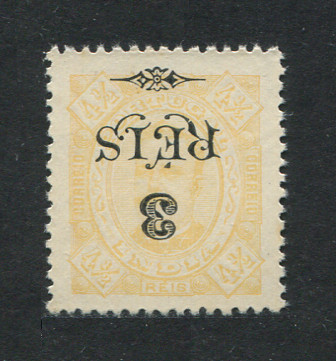1902 - Afinsa nº 177a. D. Carlos I com sobretaxa. Selo de 3r/4 1/2r novo, COM CHARNEIRA (*) e goma original. SOBRECARGA INVERTIDA. Em boas condições.