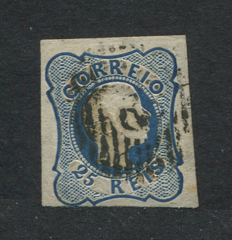 1856/8 - Afinsa nº 11. D. Pedro V. Cabelos anelados.Selo de 25 reis usado. Margens pequenas. Cunho ligeiramente aberto. EXEMPLAR de 2ª ESCOLHA.