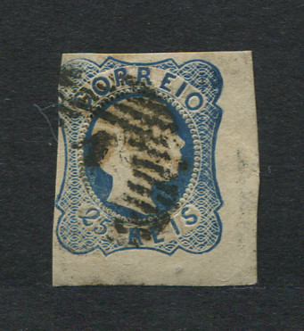 1856/8 - Afinsa nº 12. D. Pedro V. Cabelos anelados.Selo de 25 reis usado. Boas margens mas apresenta um pequeno vinco. EXEMPLAR DE 2ª ESCOLHA.