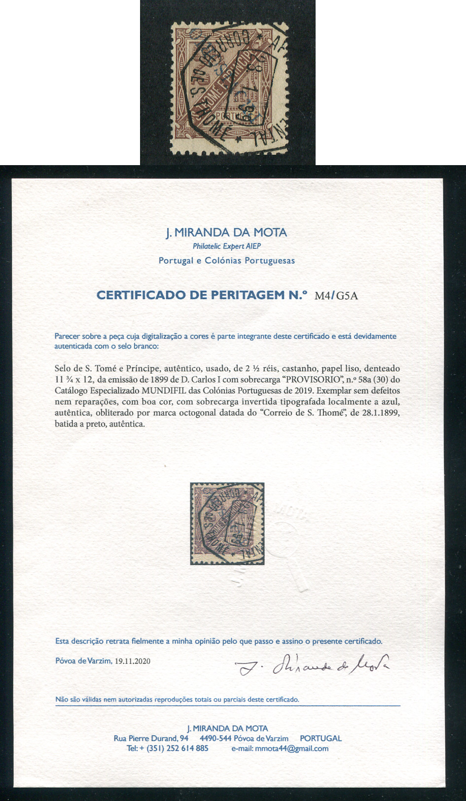 1899 - Afinsa nº 58A. D. Carlos I com sobrecarga local PROVISORIO. Selo de 2 1/2 reis usado. Denteado 11 1/2. SOBRECARGA INVERTIDA. Em boas condições. Com CERTIFICADO DE PERITAGEM (CERTIFICATE).